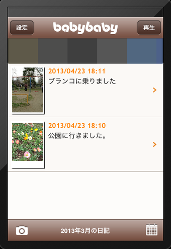 赤ちゃんパラパラ日記 baby babyは同じ日にいくつもの日記をつけることはできますが、日付をさかのぼって書いたり編集ができないので、その点でやや不便に感じるかもしれません。まとめて記録できないので、パラパラ日記を日常することの1つに習慣化しておくことをおすすめします。赤ちゃんパラパラ日記 baby babyは子どもの成長を写真に一言添えて日記にできるiPhoneのアプリです。日々、できることが増えたり表情が豊かになったり子どもの成長には目を見張るものがありますが、写真を撮っているだけではいつ、どんな場面だったか後々思い出せず、長い日記を毎日書くのも大変という人も多いでしょう。このアプリを活用して、大変なことの多い子育ての「お楽しみ」部分としてみてはいかがでしょうか。